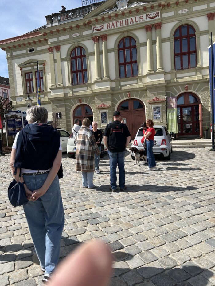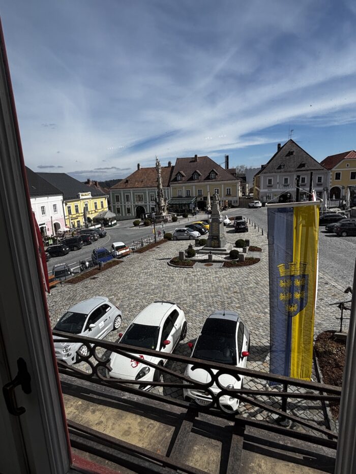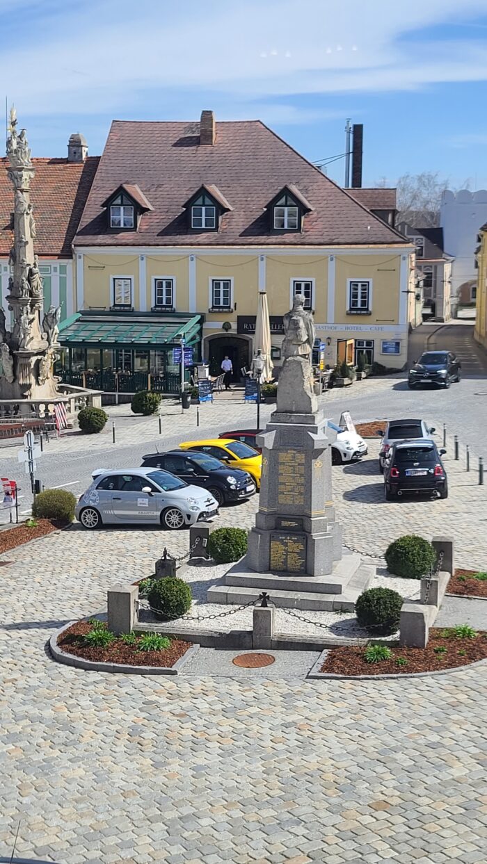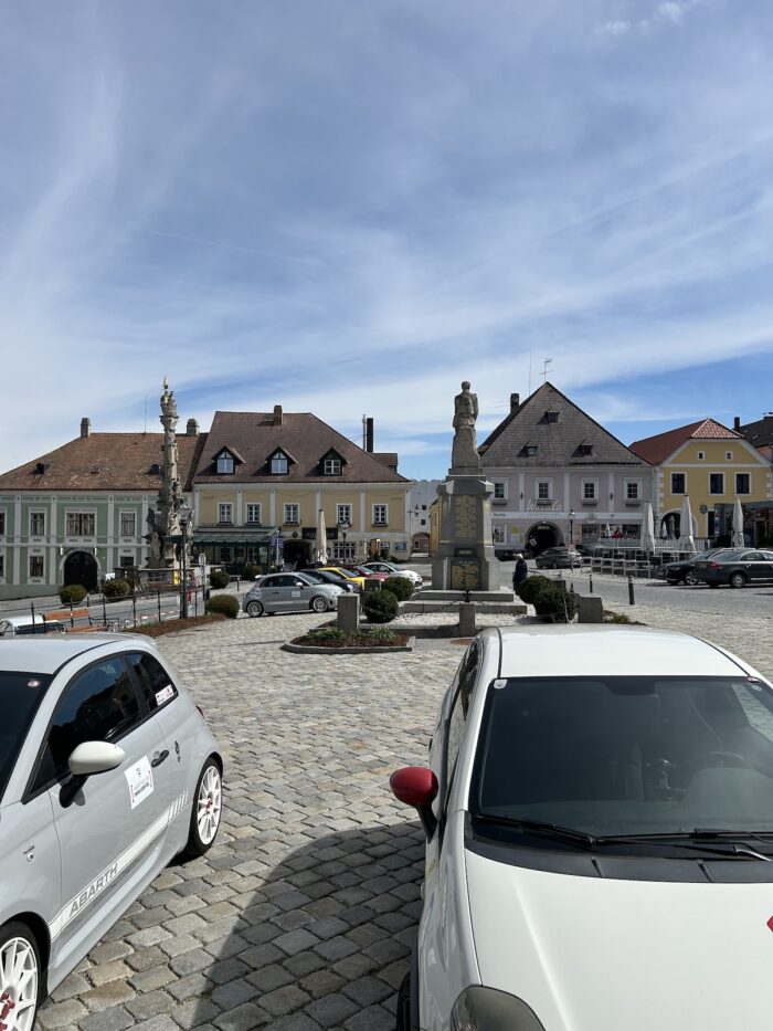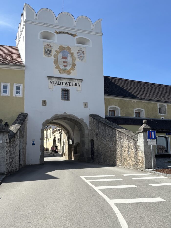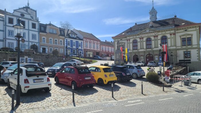 Nach gut 90 Minuten erreichten wir gegen Mittag das erste Etappenziel, Weitra, die älteste Braustadt Österreichs mit ihrer historischen Altstadt und dem imposanten Schloss. Die bezaubernde Altstadt mit dem einzigartigen Rathausplatz, den Bürgerhäusern ist fast vollständig von einer Stadtmauer aus dem 13. Jahrhundert umgeben. Wir durchfuhren das Stadttor und parkten mit Sondergenehmigung direkt vor dem Rathaus, welches erst Ende des 19. Jahrhunderts gebaut wurde.