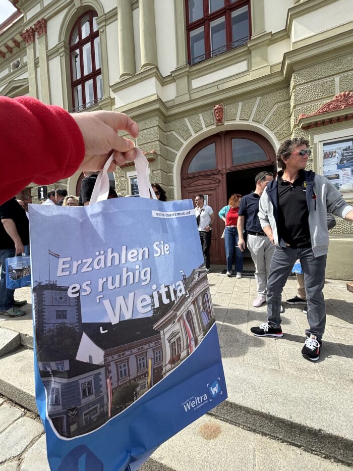 Bürgermeister Patrick Layr überreichte ich eine Innviertler Bierspezialität. Im Gegenzug erhielten alle Teilnehmer eine Tasche „Erzählen Sie es ruhig Weitra“ mit vielen Informationen über Veranstaltungen, Kunst und Kultur und ein Buch zum 700-jährigen Jubiläum der Braustadt.