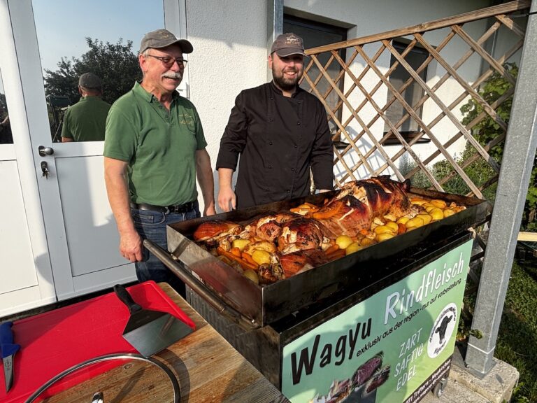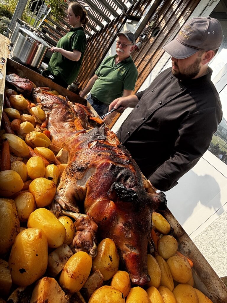 Das ‘Spofackel’, ein beeindruckendes 22-Kilo-Schwein, wurde im Holzofen in der Rein bei 320 Grad ca. 2 1/2 Stunden lang gegart.