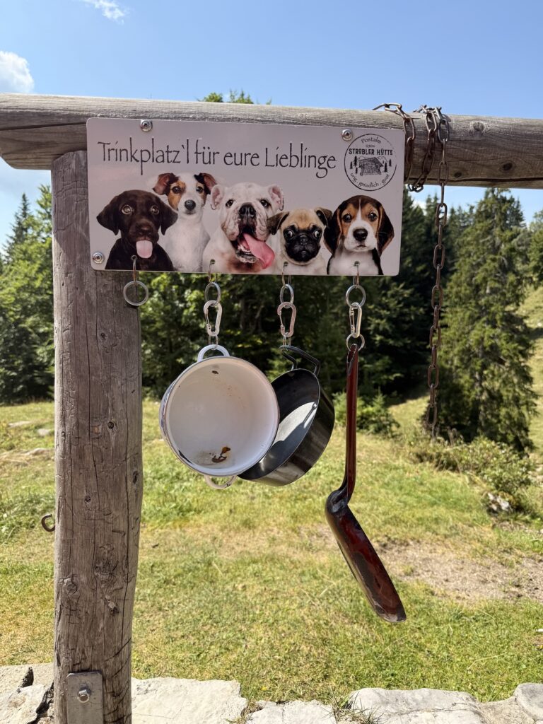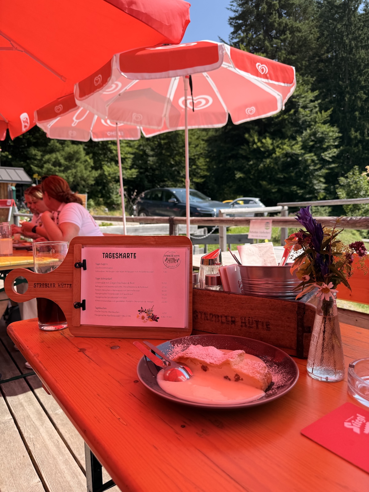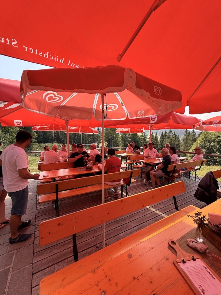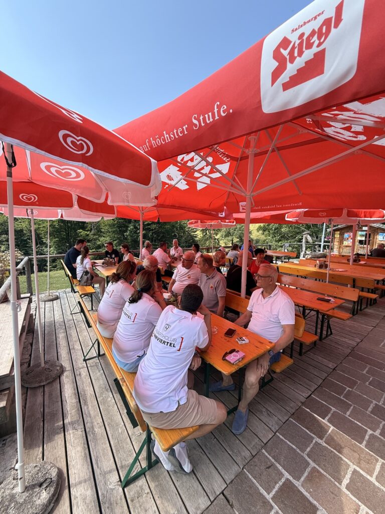 In der ‚Strobler Hütte‘ waren auf der Terrasse Tische für uns reserviert. Auf einem aussichtsreichen Logenplatz zwischen Wolfgangsee und Lammertal auf einer Seehöhe von 1.250 Metern.