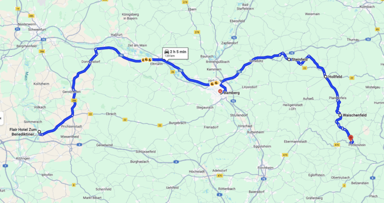 Start um 9 nach einem Genießer-Frühstück über Bamberg zum Gasthaus „Bärenschlucht“ bei Pottenstein.