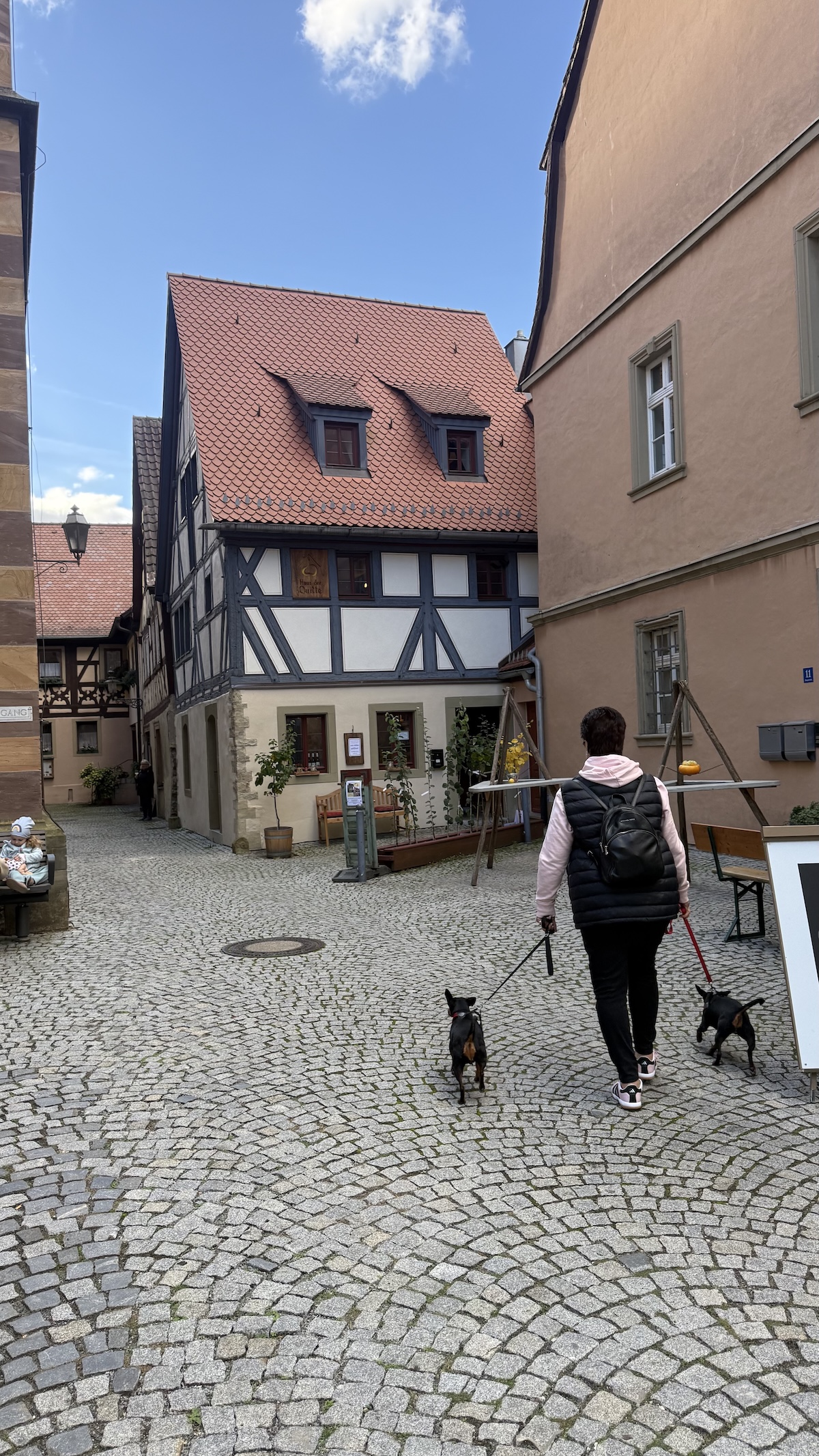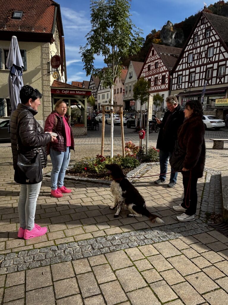 Nach über drei Stunden, die wie im Fluge vergingen, machten wir uns auf den Weg nach Schwarzach. Dort trafen wir uns mit Annemarie, Bea und Simonetta, die mit ihren Vierbeinern auf uns warteten. Gemeinsam fuhren wir dann nach Volkach.