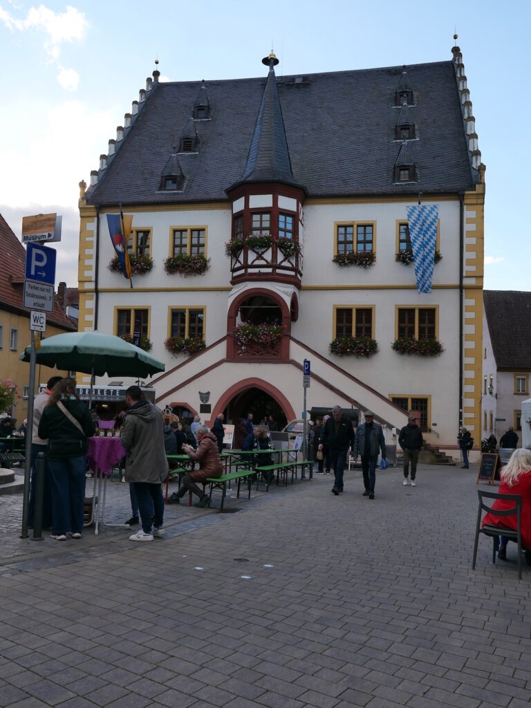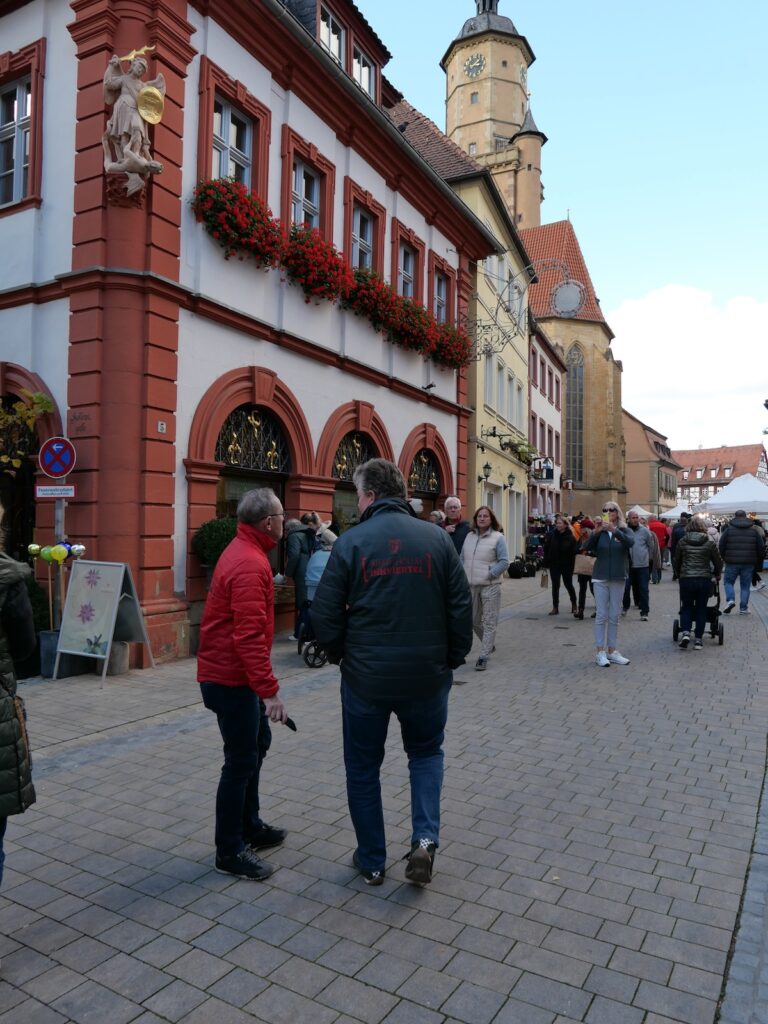 Annemarie, Carlo und ich machten uns gegen Mittag auf die Reise. Kurz vor Nürnberg der Verkehrshinweis, „Stau auf der A3“, mindestens 30 Minuten Verzögerung. Wir bemühten das Navi, das uns über die B8 zum Ziel Schwarzach am Main führte. In Iphofen machten wir einen Stopp. Iphofen hat sich durch den Weinanbau auch überregional einen Namen gemacht. Wir schlenderten durch die romantischen Gassen und bewunderten die wunderschön renovierten Häuser in der historischen Altstadt. Sehenswert die Stadtpfarrkirche, die gute erhaltene Stadtmauer und das bekannte Rödelseer Tor.