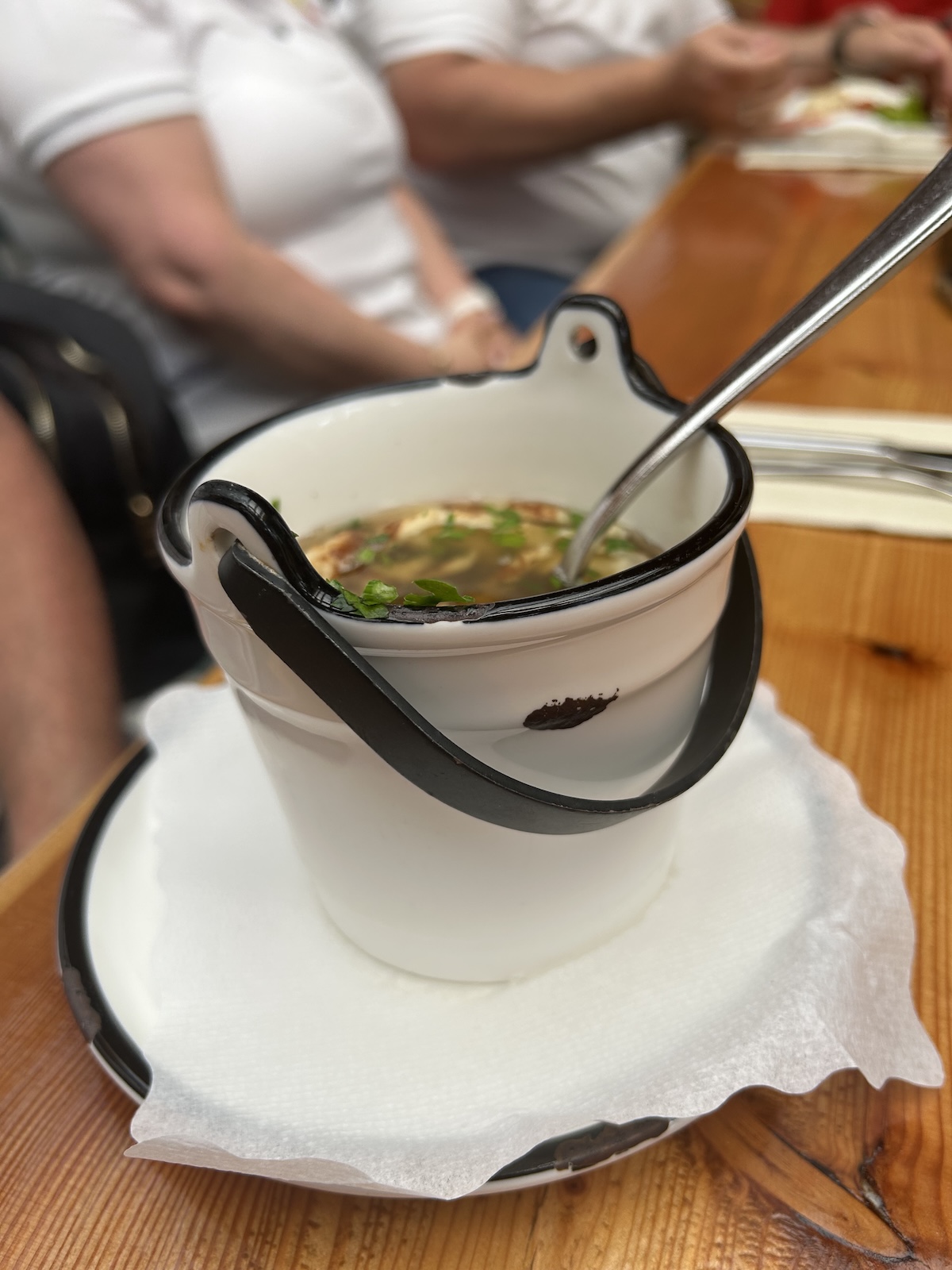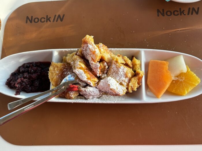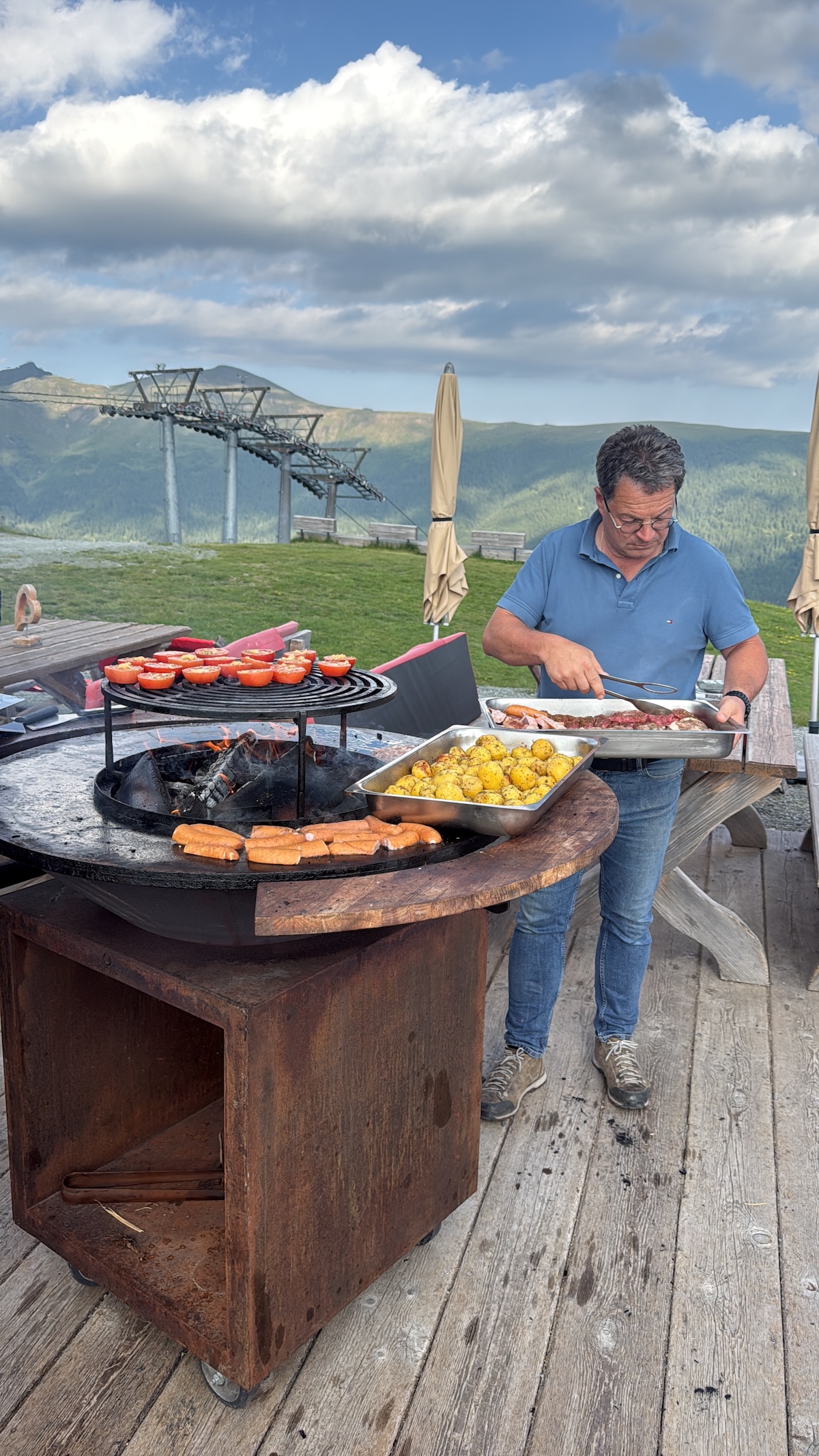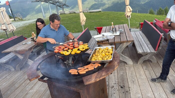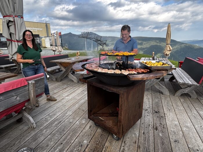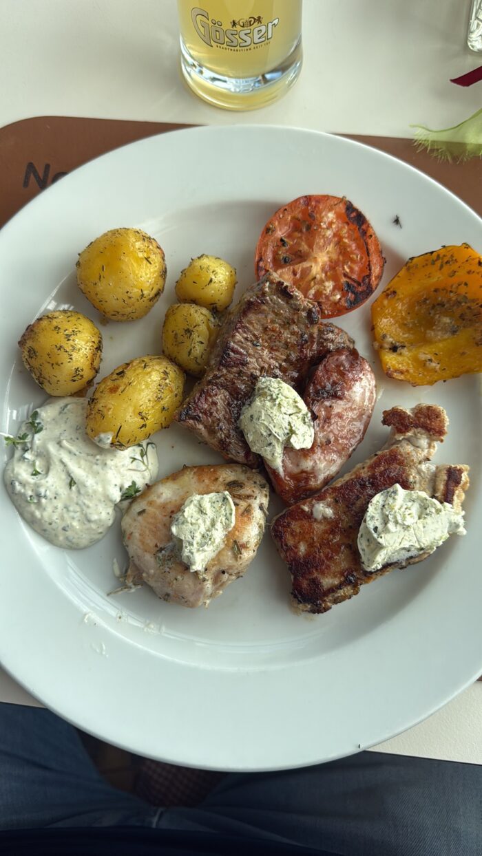 Serviert wurde ein 3-Gänge-Menü: Gemüsesuppe, verschiedene Fleischsorten, Gemüse und Kartoffeln vom Holzkohlengrill und zum Dessert Kaiserschmarren mit Heidelbeeren bzw. Eiskaffee. Alles sehr köstlich zubereitet. Ein Genuss.
