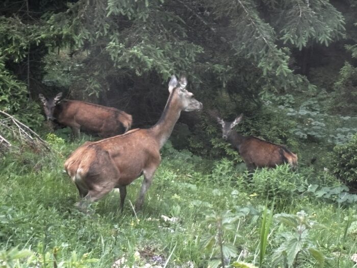 Wenige Meter rechts von uns, drei Hirsche, die in aller Ruhe weiter ästen.