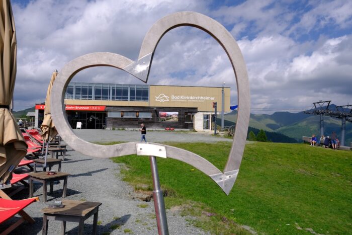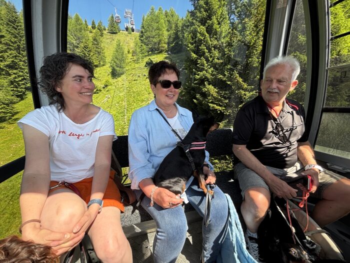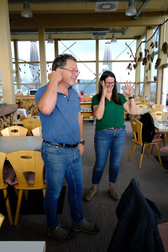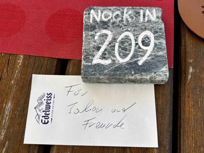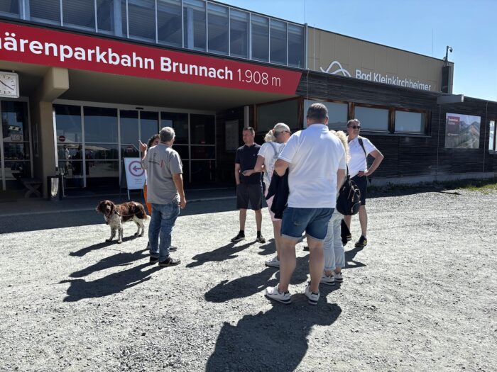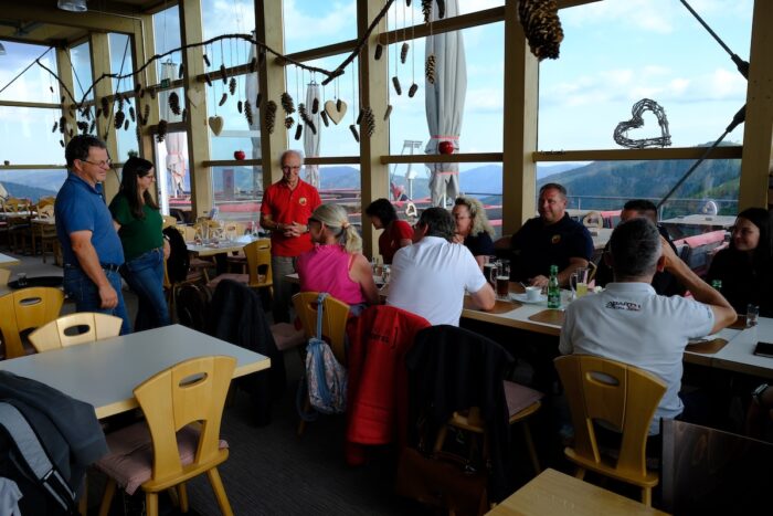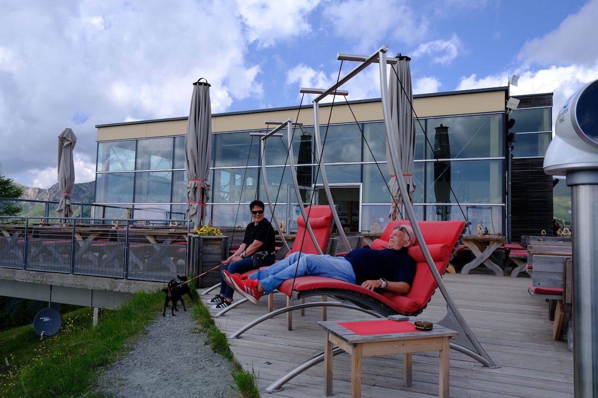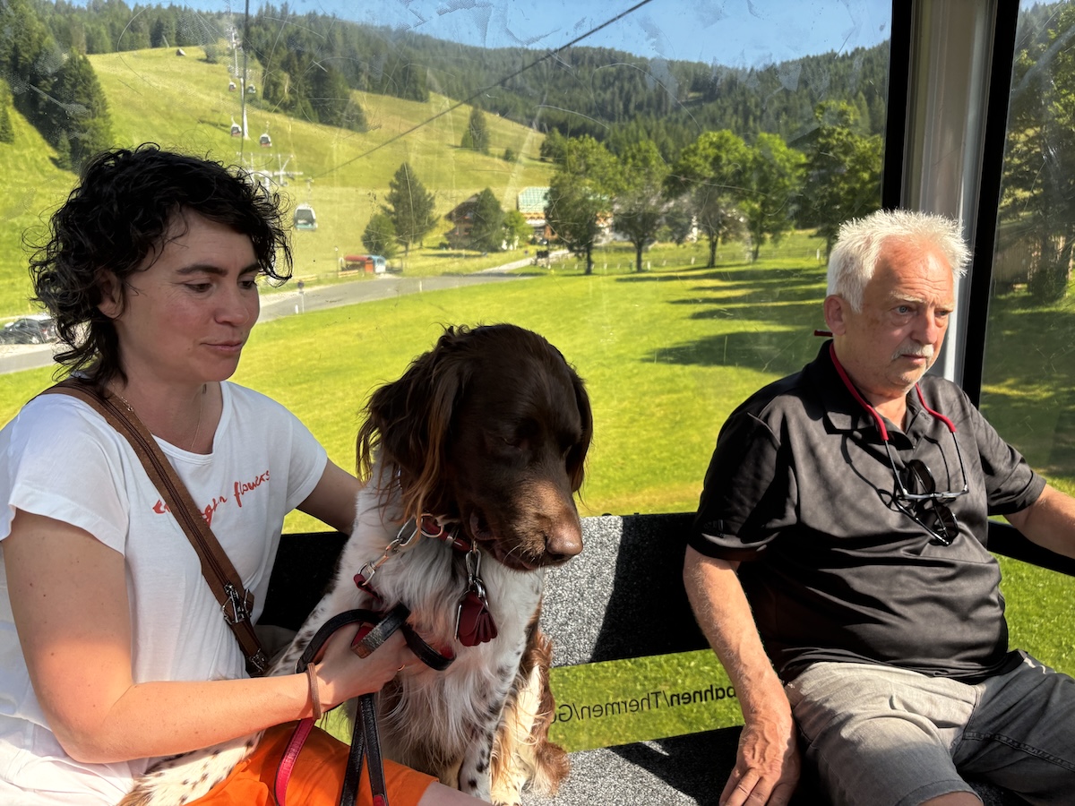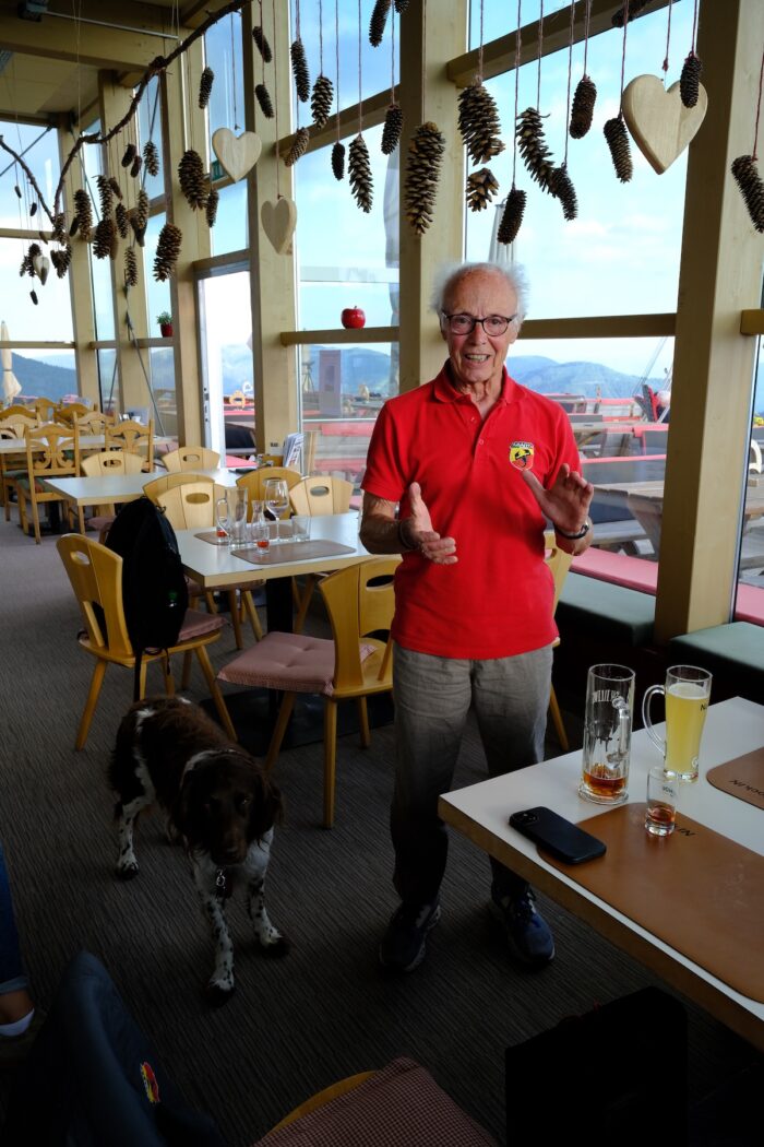 Am Sonntagmorgen bei herrlichstem Sonnenschein noch einmal mit der ‚Brunneck Bahn‘ rauf zum ‚Panaroma-Restaurant NockIn‘. Zu sechst plus drei Vierbeiner saßen wir in der Gondel. Andy konnte es nicht lassen mit seinen lockeren Sprüchen, von wegen: was ist, wenn die Gondel stehen bleibt? Werden wir dann abgeseilt oder kommt ein Hubschrauber, um uns………….Nach knapp 15 Minuten erreichten wir die Bergstation.