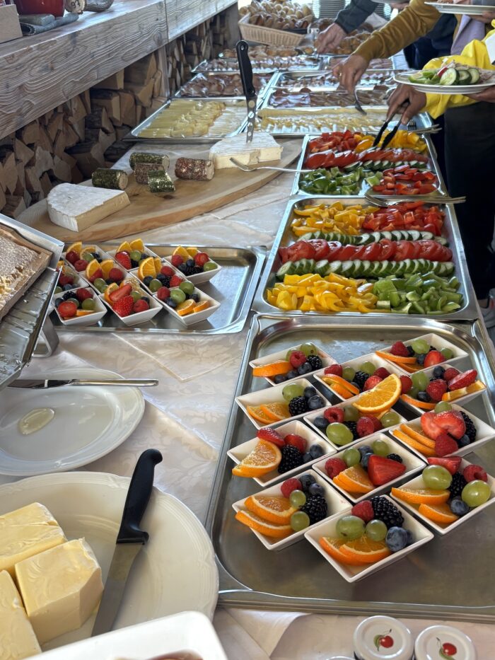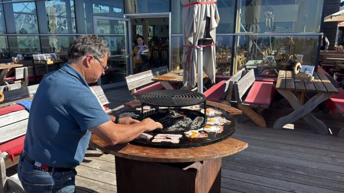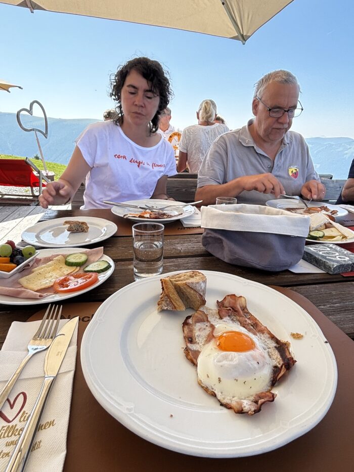 Auf der Sonnenterrasse wurde uns ein leckeres, rustikales Frühstück geboten – mit Spiegeleiern und Speck vom Holzkohlengrill – Grillmeister: Christian.