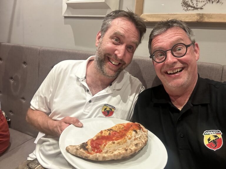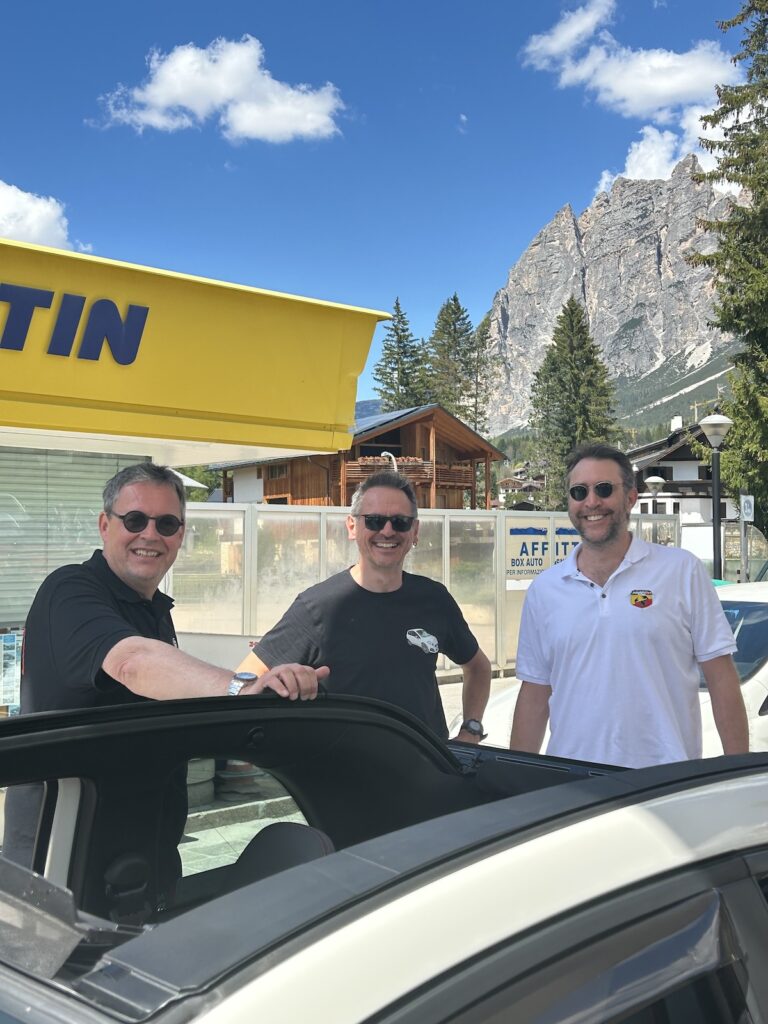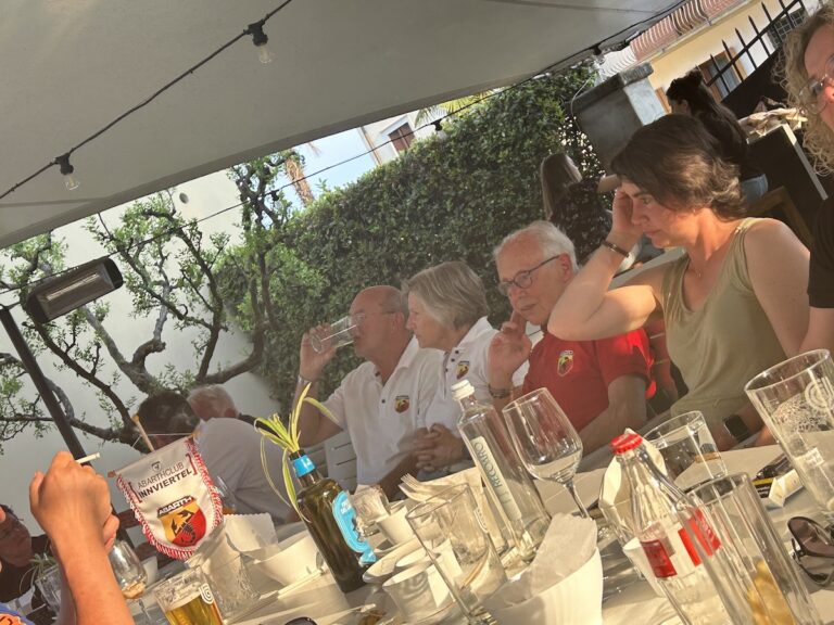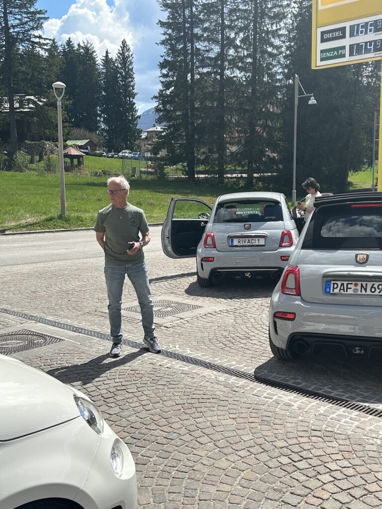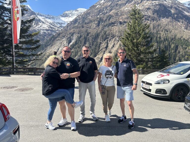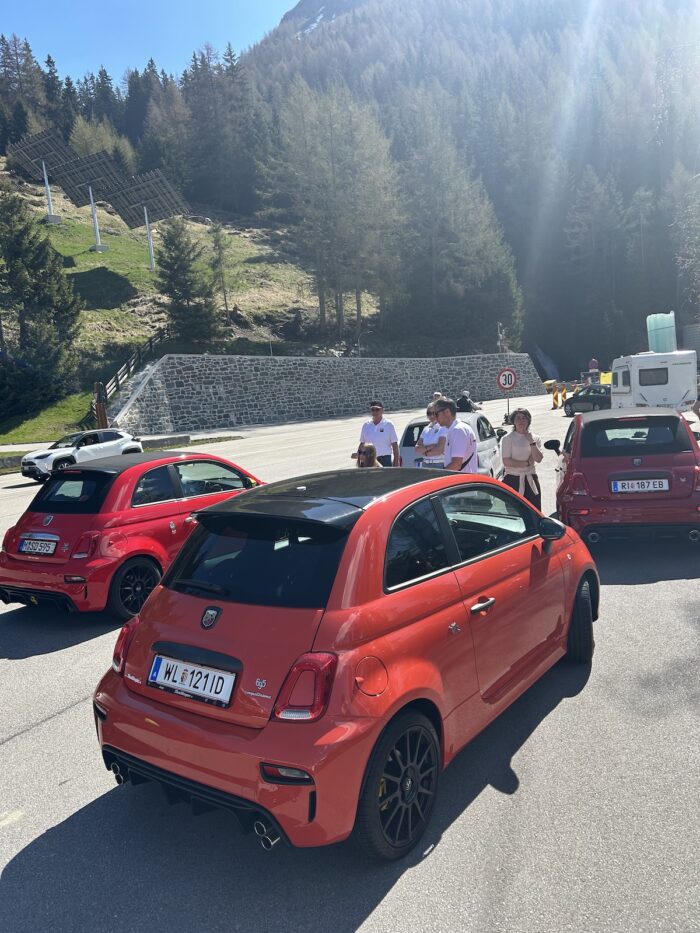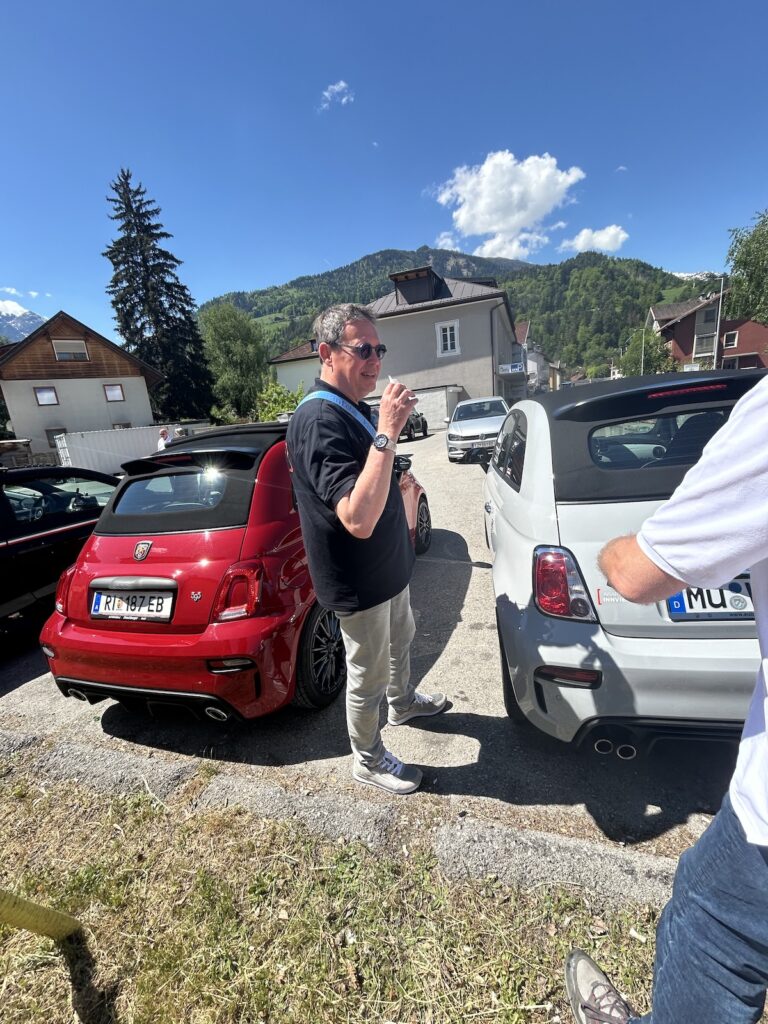Letzten Donnerstag war es dann endlich so weit. Erster gemeinsamer Treffpunkt für 12 Abarth + Begleitung: das Café Neumayr in Aurach bei Kitzbühel, gleichzeitig der Start via Felbertauern nach Lienz. Gegen Mittag trafen wir in „Chickis“ Hendlstation ein – knusprig und goldbraun gegrillte Hendln erwarteten uns bereits – dazu gab’s je nach Gusto: eine Semmel oder Pommes oder hausgemachten Kartoffelsalat. Lecker war’s.