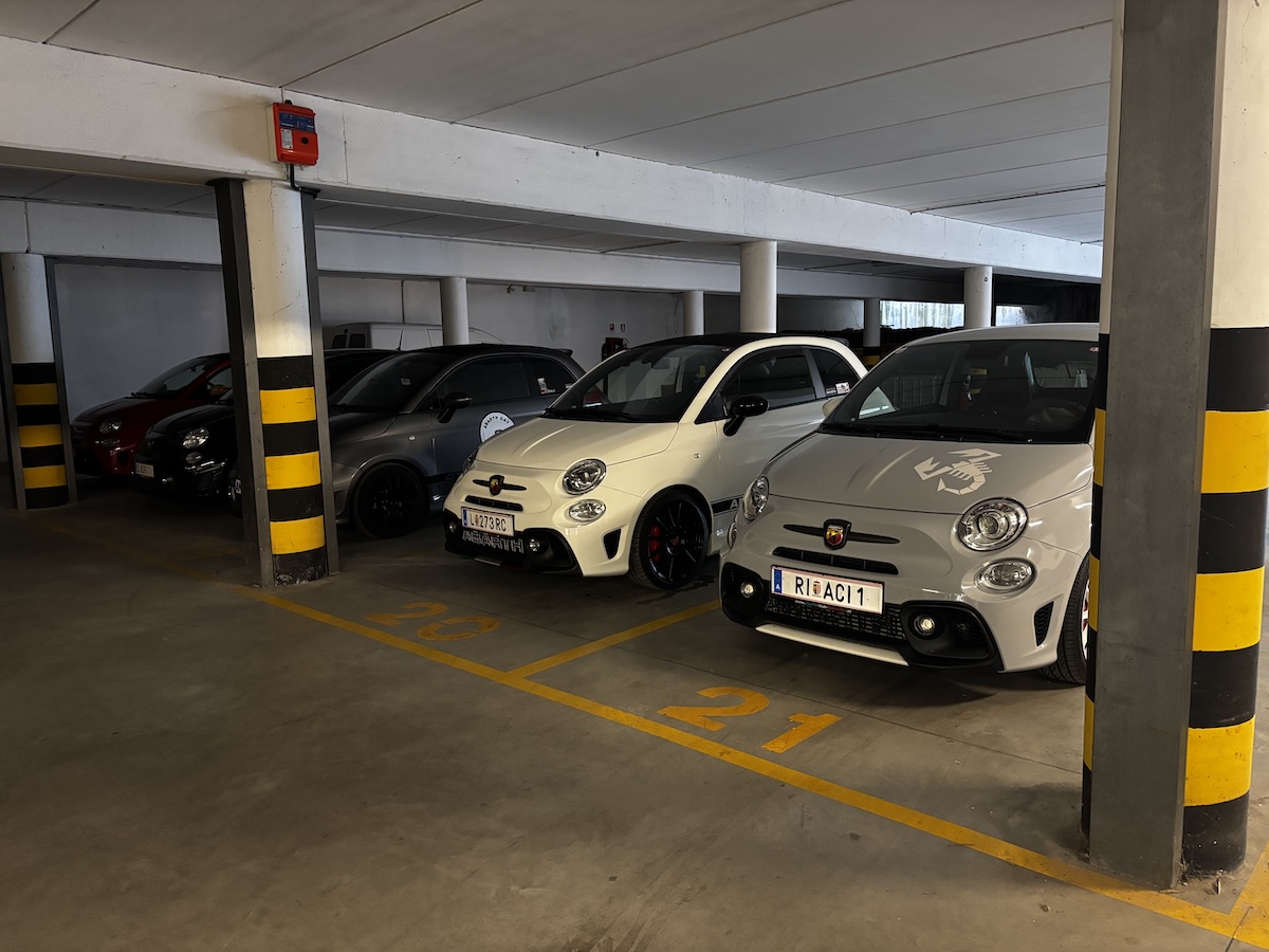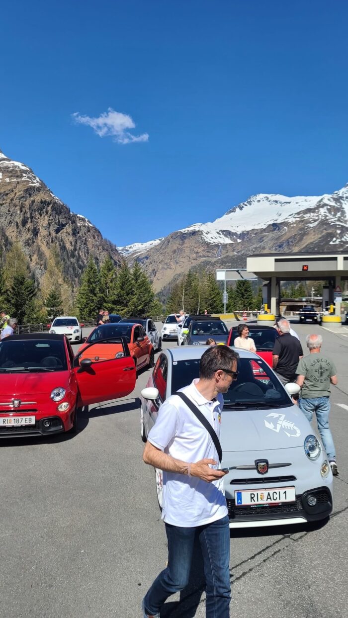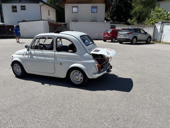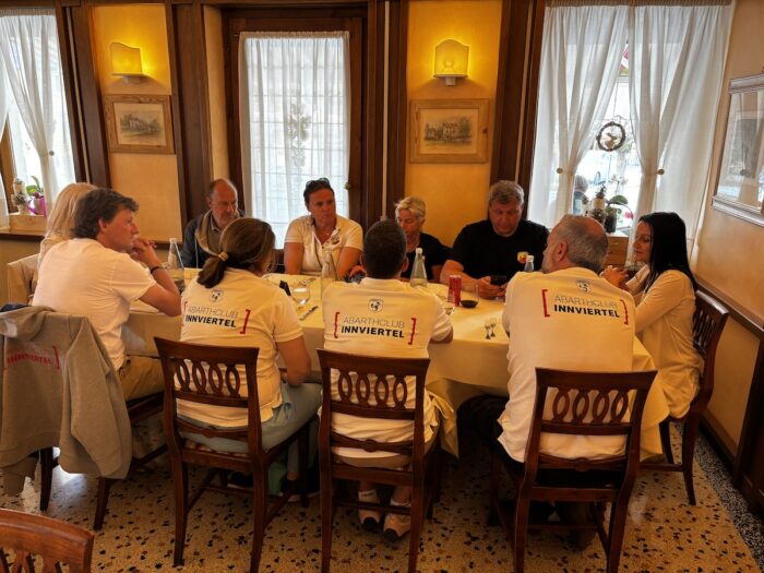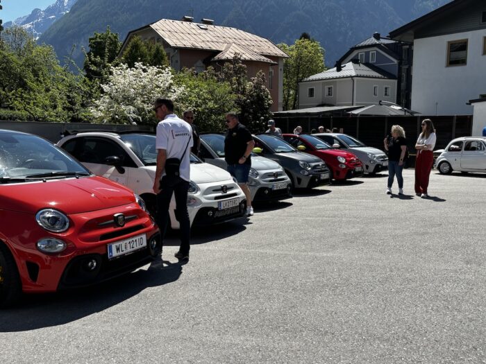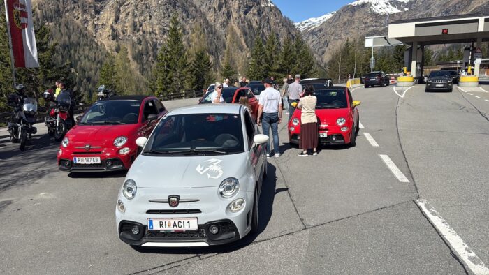 Letzten Donnerstag war es dann endlich so weit. Erster gemeinsamer Treffpunkt für 12 Abarth + Begleitung: das Café Neumayr in Aurach bei Kitzbühel, gleichzeitig der Start via Felbertauern nach Lienz. Gegen Mittag trafen wir in „Chickis“ Hendlstation ein – knusprig und goldbraun gegrillte Hendln erwarteten uns bereits – dazu gab’s je nach Gusto: eine Semmel oder Pommes oder hausgemachten Kartoffelsalat. Lecker war’s.