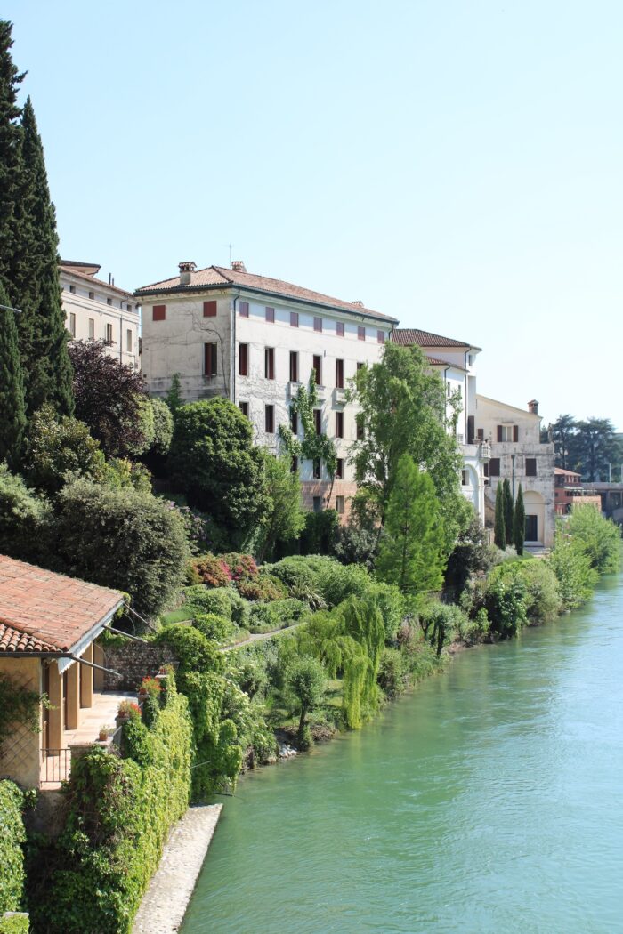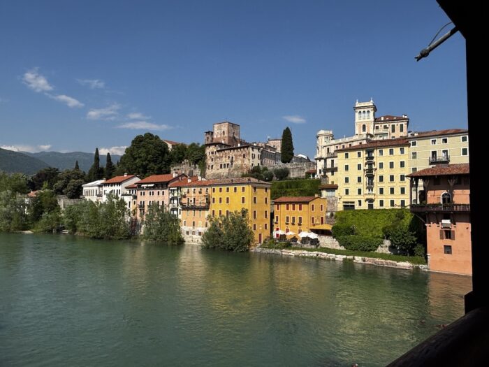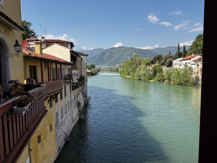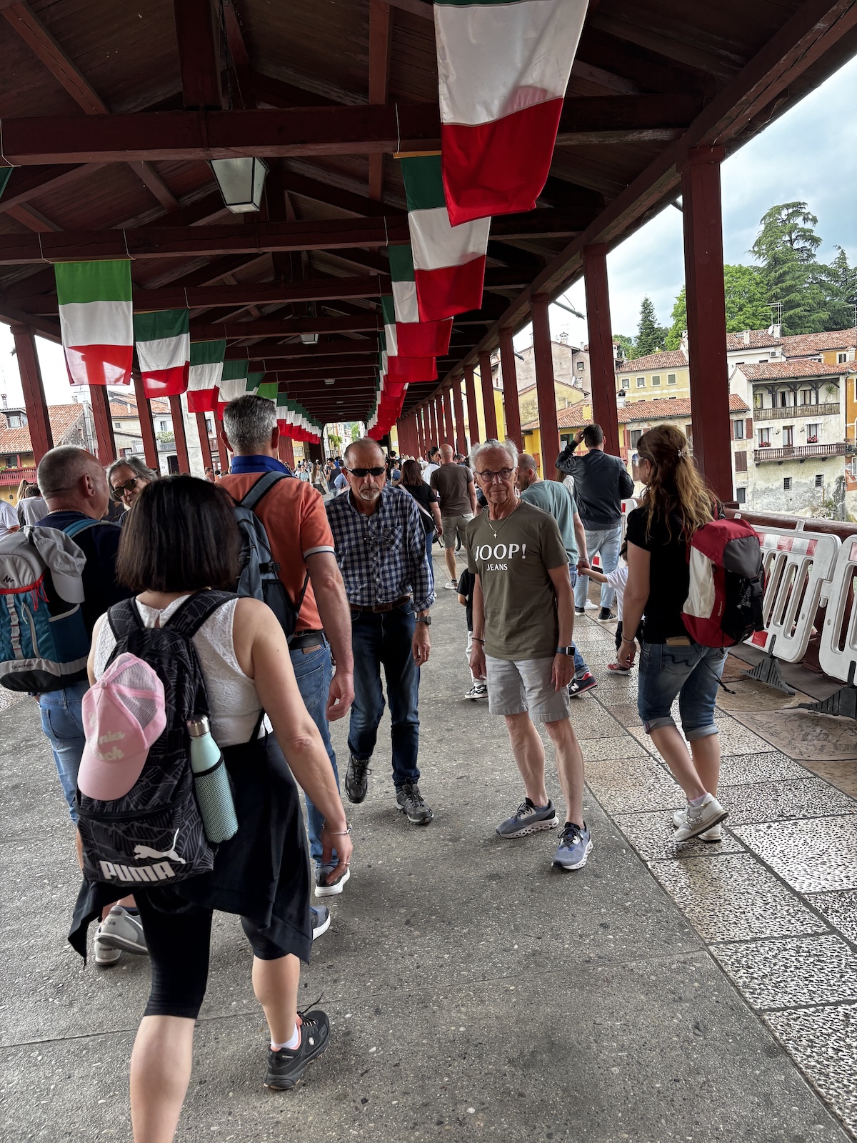 Annemarie, Armin, Celina, Simonetta, Wolfgang und ich und unsere drei Vierbeiner hatten hier im Hotel verlängert, um die Gegend weiter kennenzulernen. Wir sechs machten uns dann auf nach Bassano del Grappa. BDG ist eine bedeutende Kleinstadt mit bewegender Geschichte an den Ufern der Brenta. Obwohl die Stadt in beiden Weltkriegen stark zerstört wurde, hat das Stadtzentrum sein ursprüngliches Aussehen bewahrt.