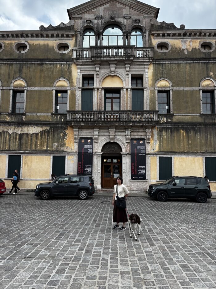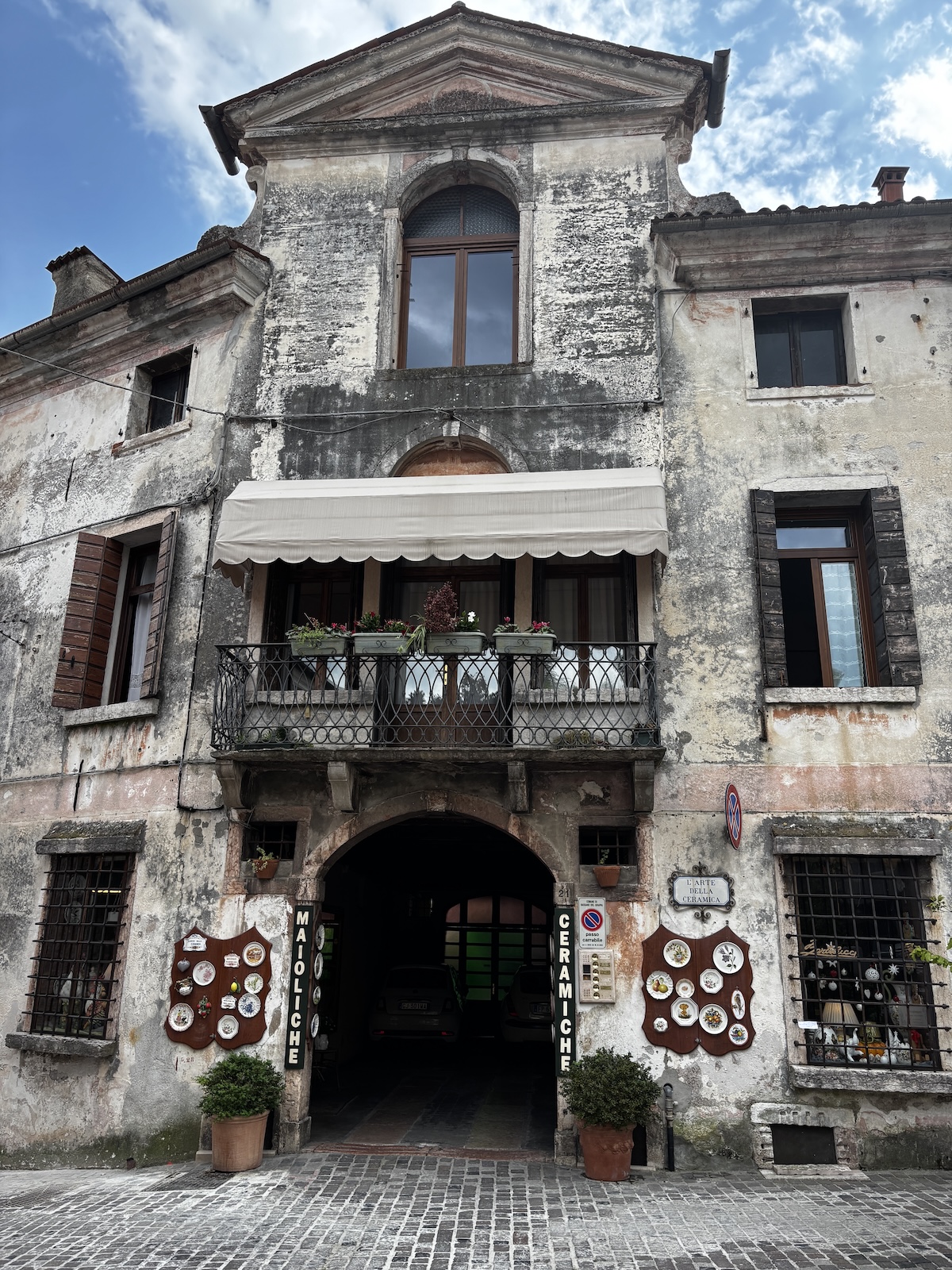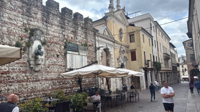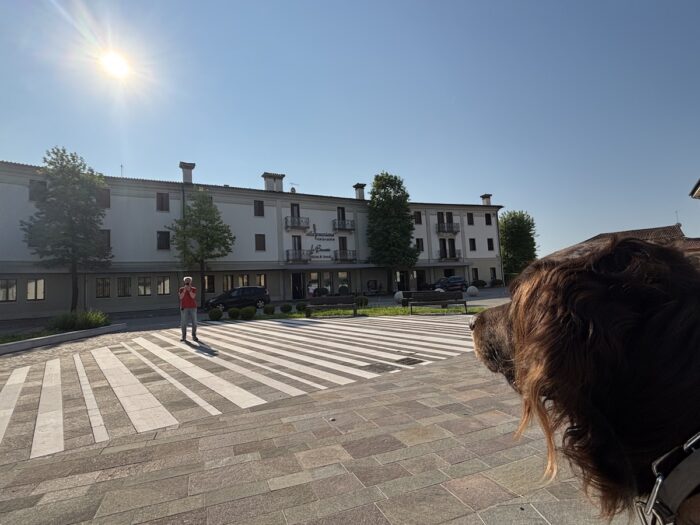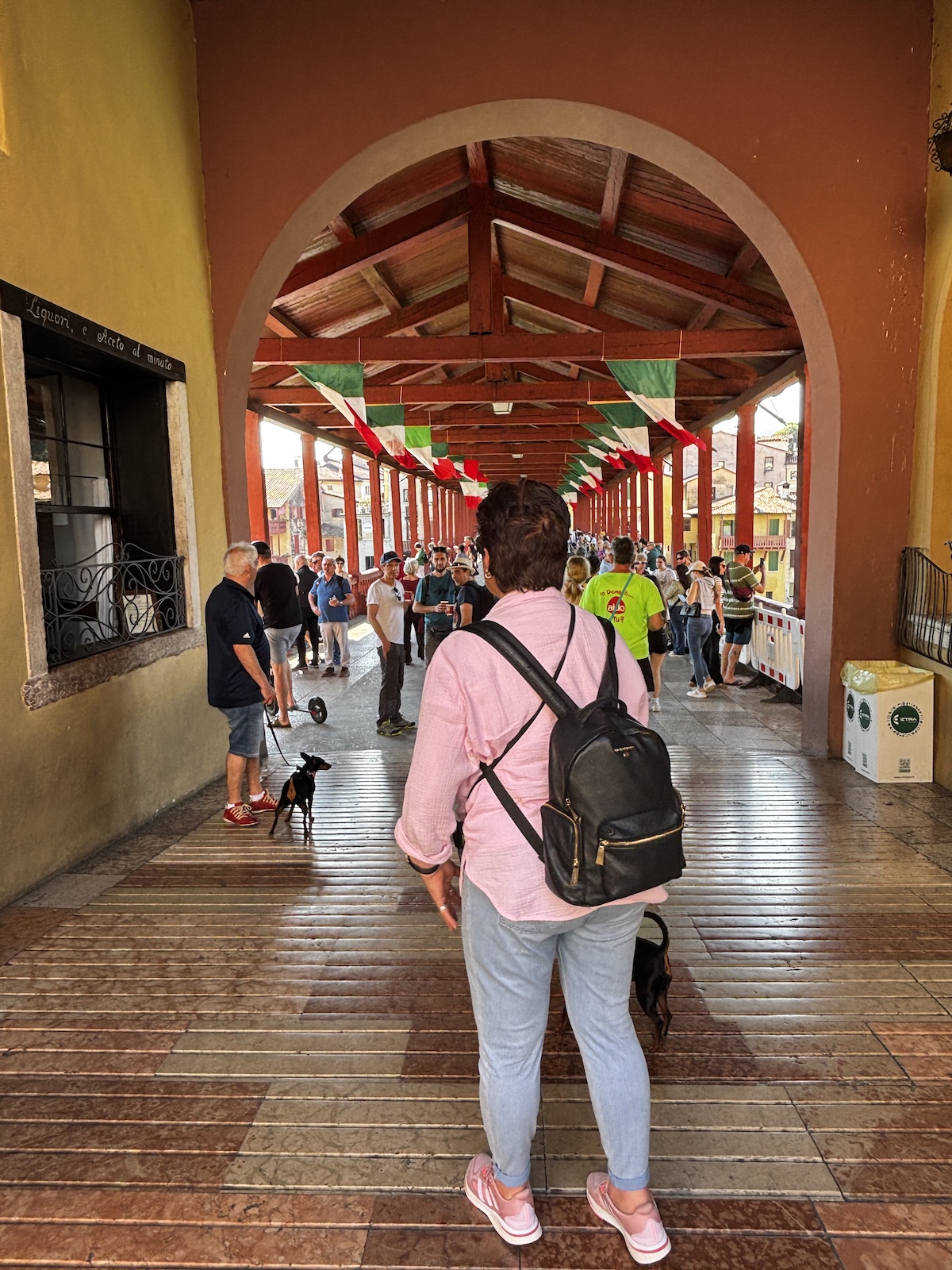 Annemarie, Armin, Celina, Simonetta, Wolfgang und ich und unsere drei Vierbeiner hatten hier im Hotel verlängert, um die Gegend weiter kennenzulernen. Wir sechs machten uns dann auf nach Bassano del Grappa. BDG ist eine bedeutende Kleinstadt mit bewegender Geschichte an den Ufern der Brenta. Obwohl die Stadt in beiden Weltkriegen stark zerstört wurde, hat das Stadtzentrum sein ursprüngliches Aussehen bewahrt.