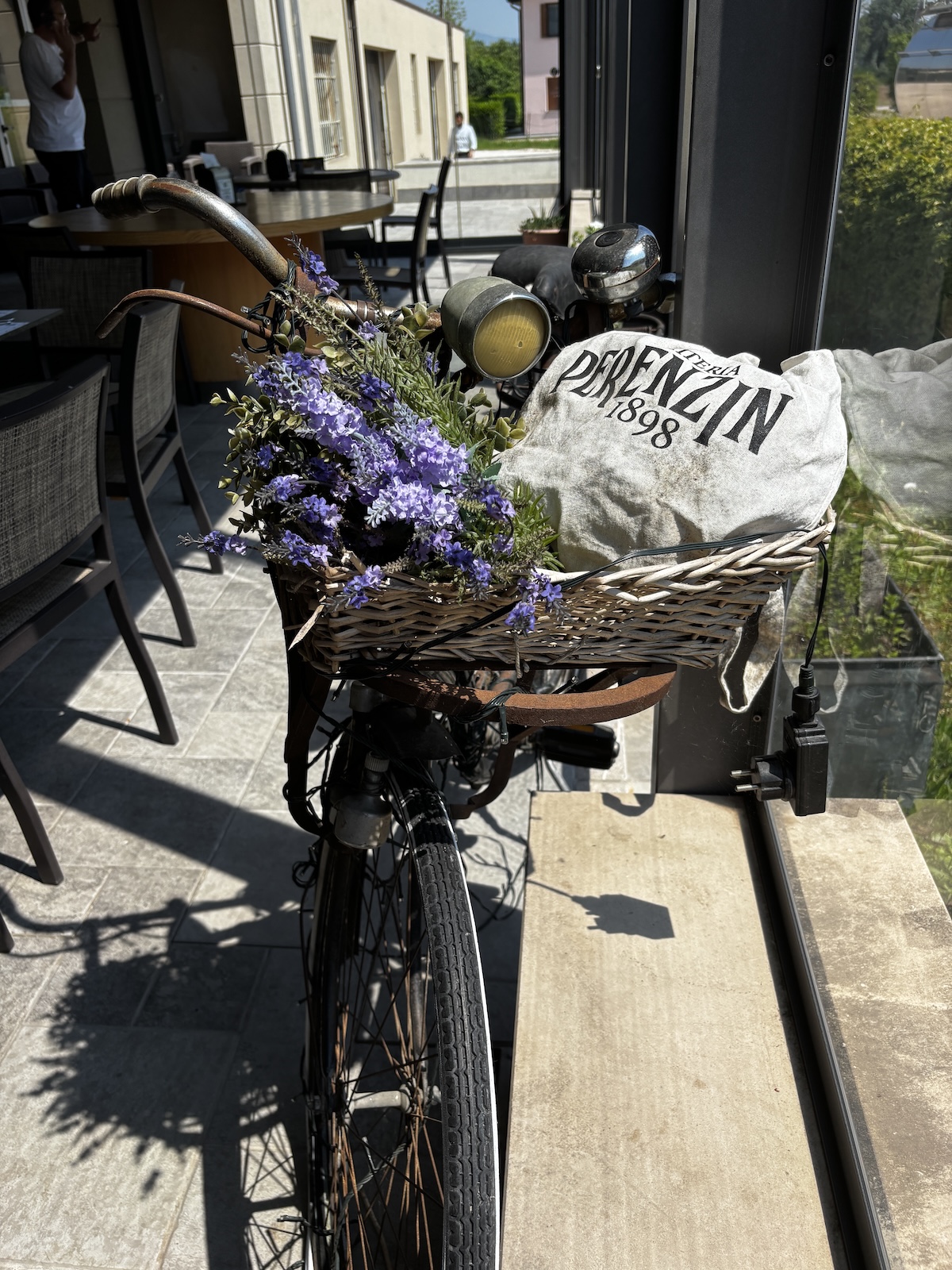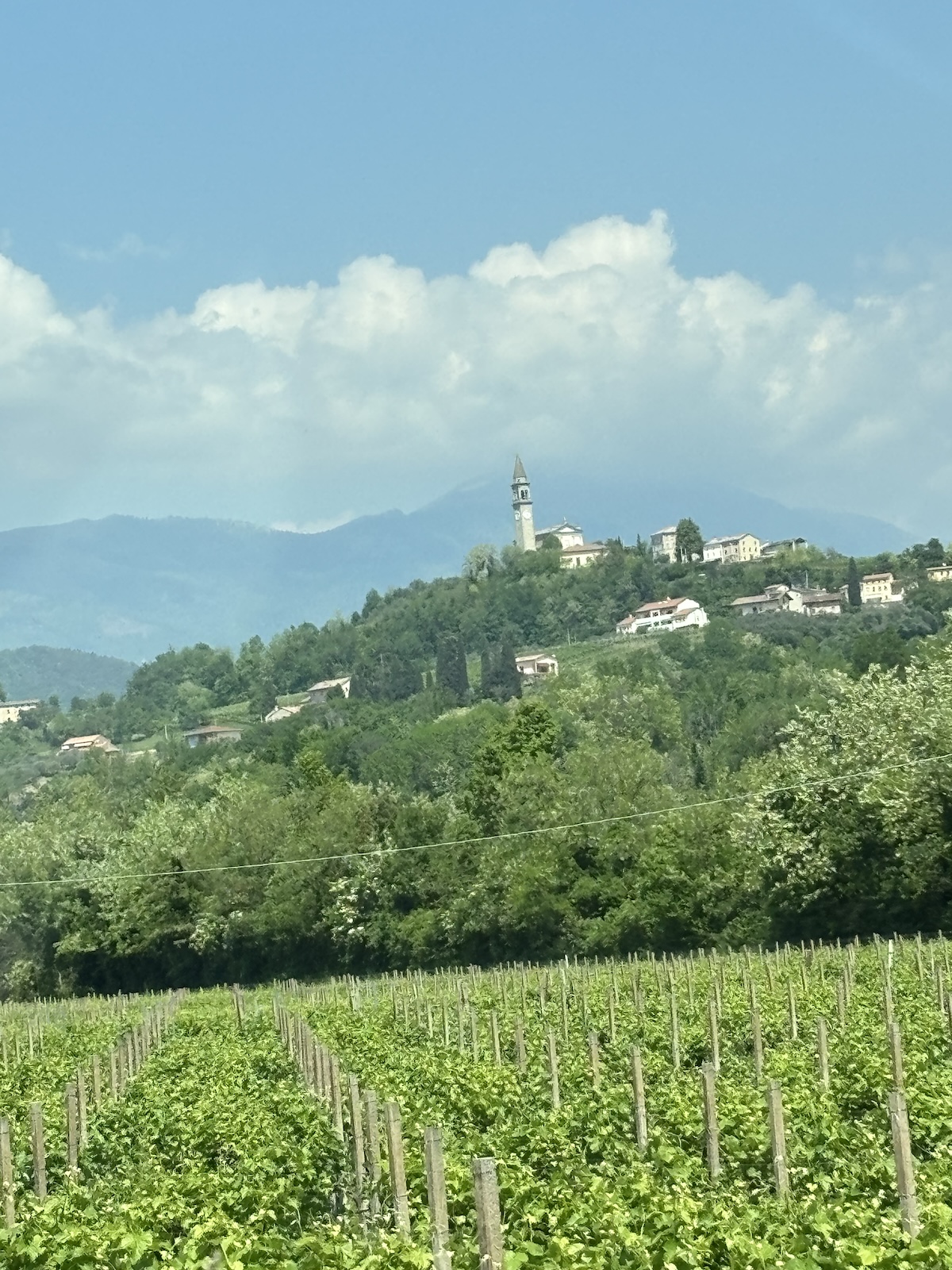 Die Sonne lacht und der gute Morgen begann mit einem reichhaltigen Frühstücksbuffet extra frischer Produkte, herzhaft bis dolce, gesund oder einem frisch gebackenen Kuchen. Gestärkt hieß es aufsitzen zur ‚Prosecco-Tour‘. 172 km lagen vor uns. Bis Conegliano viel Verkehr bei einer eher langweiligen Landschaft. Dann wurde es interessant.