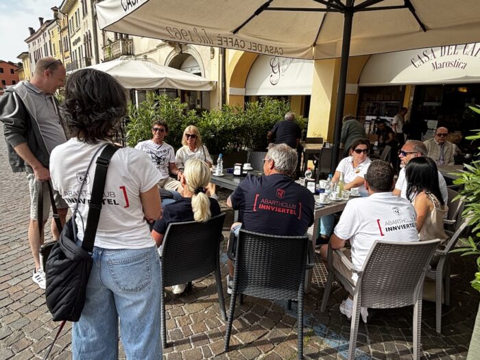 Alle Abarth fanden einen Platz. Auch trafen wir hier die vier Paare, die erst heute zu uns gestoßen sind – perfetto. Drei Stunden waren für einen Stadtrundgang eingeplant, um in kleineren oder größeren Gruppen die sehenswerte Stadt des ‚Grappa‘ zu erkunden. Ich will jetzt keine weiteren Worte verlieren, da wir Bassano noch einmal besuchen und dann ausführlicher berichten.