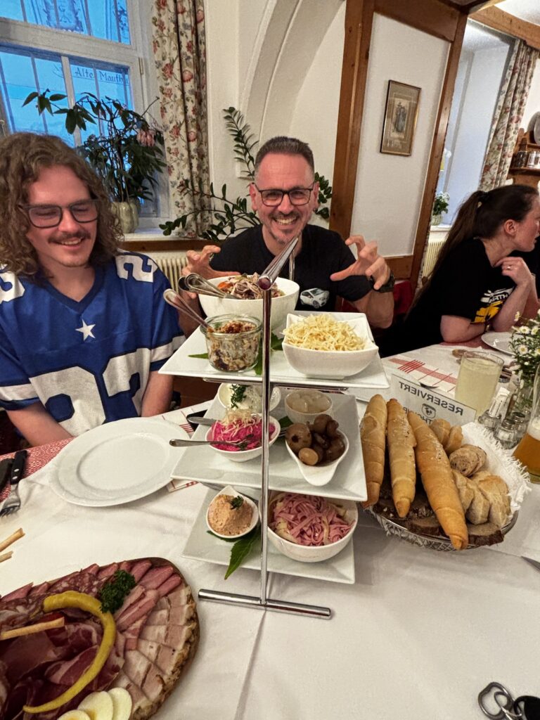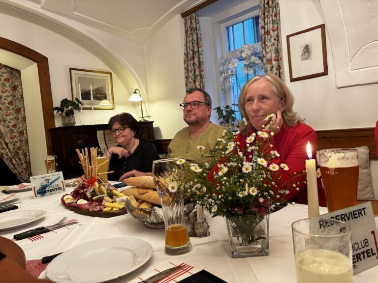 Gegen 18:30 trafen wir uns in der Braustube zur fast schon traditionellen „Steirischen Jause“. Dazu ein frisch gezapftes Gösser oder einen leckeren Weiß- oder Rotwein aus dem Weinkeller, der so manche Schätze beherbergt.