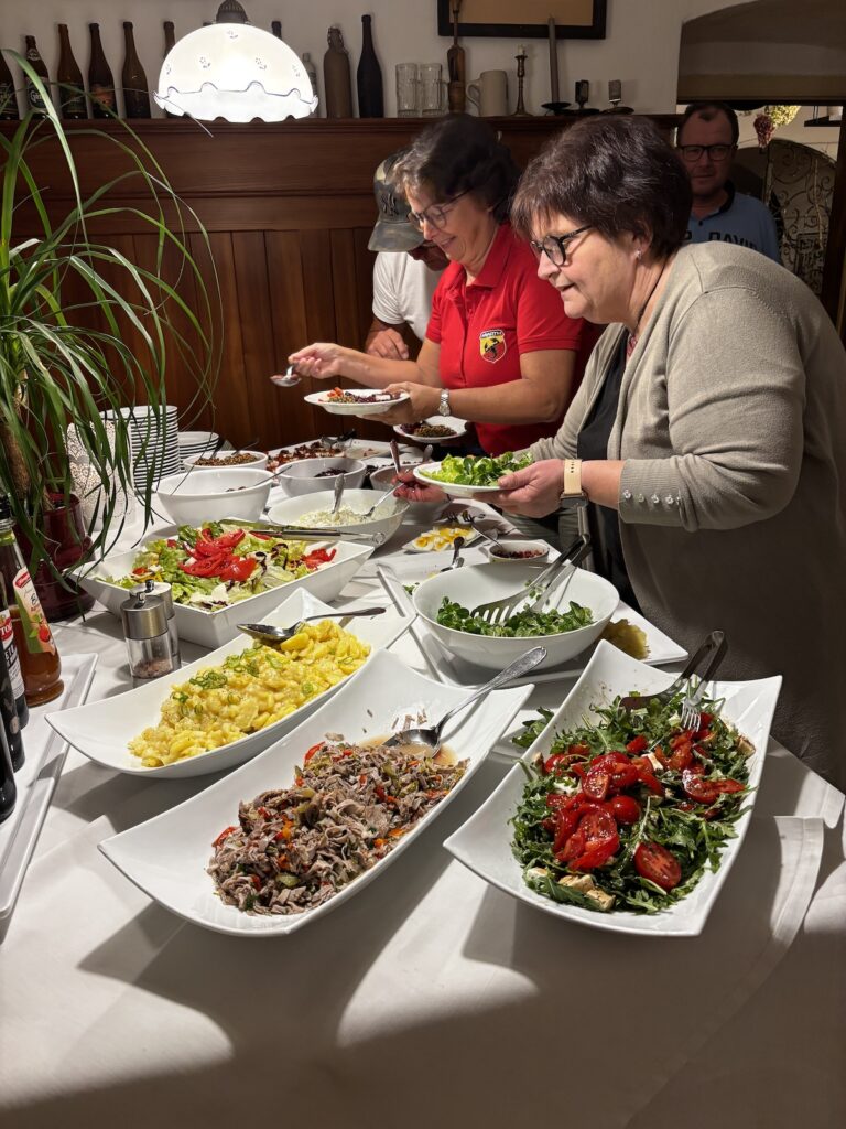 In der wohlriechenden „Kuchl“ hat Barbara ein wunderbares 3-Gänge-Menü für uns gezaubert: Wir starteten mit einer köstlichen Kürbiscremesuppe, gefolgt von einem herzhaften Backhendl. Der Hauptgang war ein absoluter Genuss mit Schweinsbraten, Knödeln und Kartoffeln, dazu gab es eine Auswahl an verschiedenen Salaten. Zum Abschluss verwöhnte uns Barbara mit einem leckeren Apfelstrudel und einer Marillenroulade. Alles war einfach hervorragend, und wir haben es uns richtig gut gehen lassen!