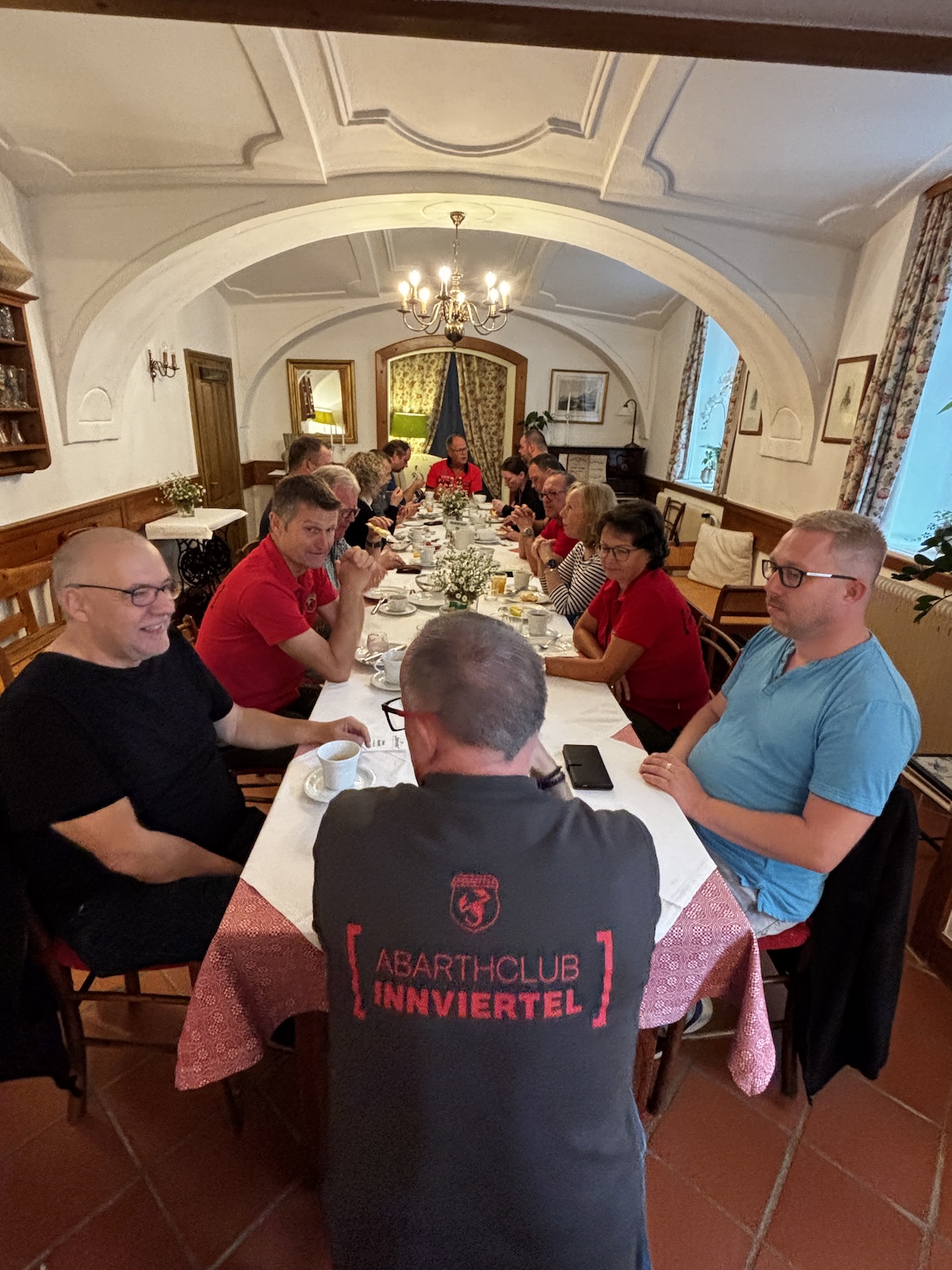 9 Abarth und 16 Personen trafen sich im „Gasthaus See“ am Mondsee, bei etwas trübem Wetter, zur Mittagszeit.