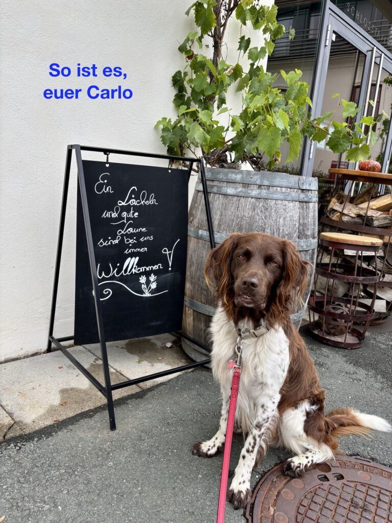 Wir setzten uns in unsere Knallbüchsen. Die Passanten, die uns begegneten, winkten uns freundlich zu. Durch die Weinberge, die Lese hat bis jetzt nicht überall stattgefunden. So leuchteten uns die blauen Trauben entgegen.