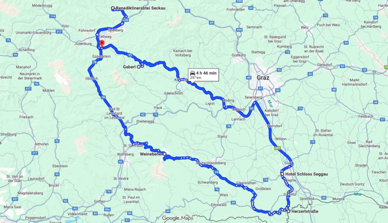 Gasthof Bräuer (689 m) > Schloss Seggau (350 m) > Herzerlstraße (427 m) > Weinebene/Passhöhe (1668 m) Stift Seckau (844 m)
