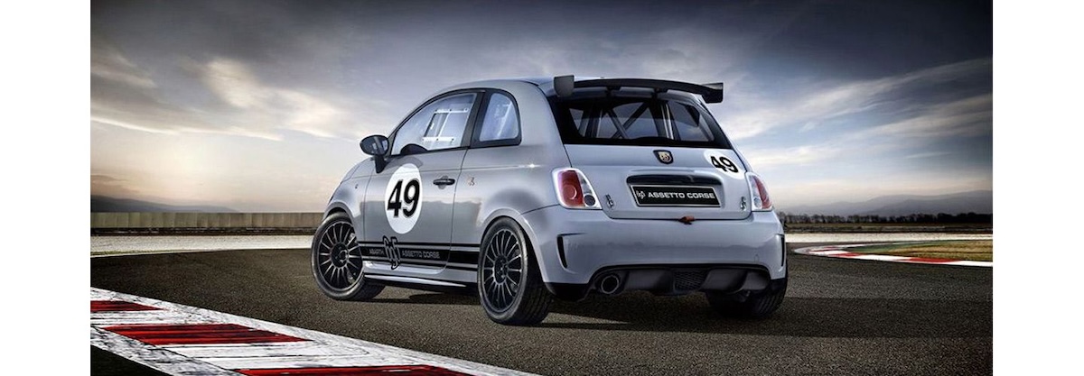 Der 500 Abarth Assetto Corse, entwickelt in Zusammenarbeit mit Abarth Ingenieuren, ist ein eigenständiges Modell. Er ist ausschließlich in Pastellgrau lackiert und trägt die typischen roten Abarth Streifen mit Signet sowie eine stilisierte Zielflagge auf dem Dach. Der Abarth Schriftzug am Lufteinlass, das Markenlogo und das Skorpion-Symbol auf der Motorhaube zeigen seine Zugehörigkeit zur Turiner Sportwagenfamilie. Die Aerodynamik wurde für den Rennsport optimiert mit tiefem Frontspoiler, kleinem Dachflügel und speziellen Außenspiegeln.